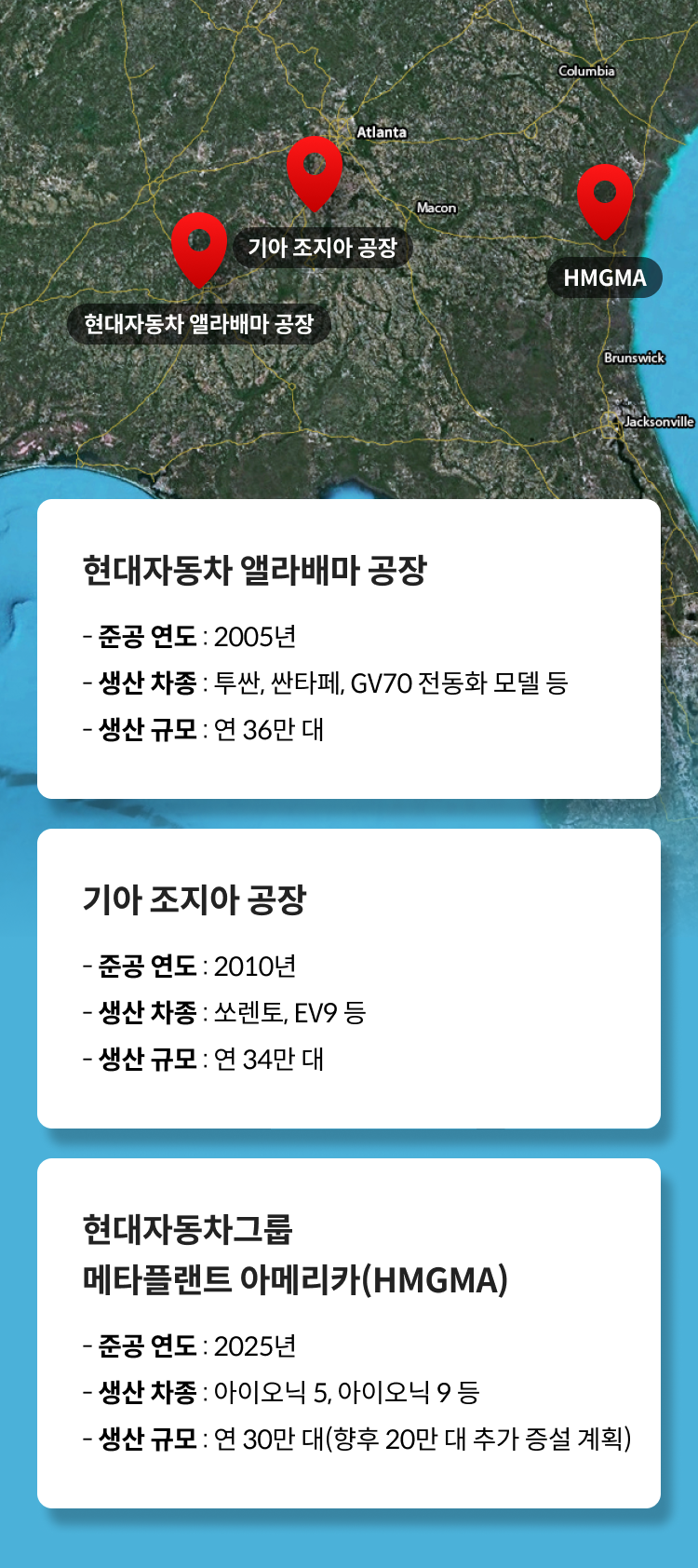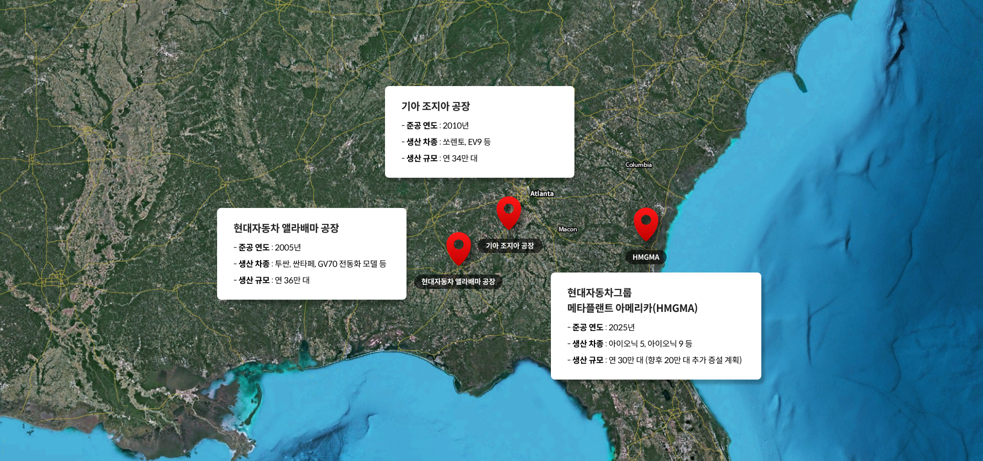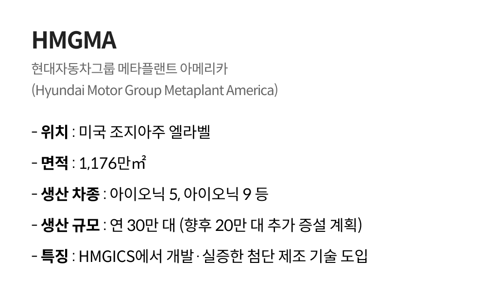 HMGMA는 현대자동차, 기아, 제네시스 전기차를 모두 생산하는 그룹 최초의 통합 생산 거점으로, 현대자동차 앨라배마 공장, 기아 조지아 공장을 합산해 미국 현지 연 100만 대 생산 체제를 구축하게 되었습니다. 2005년 앨라배마주에 현대자동차 공장을 가동하며 미국 현지 생산 도전장을 내민 지 20년 만의 일입니다.