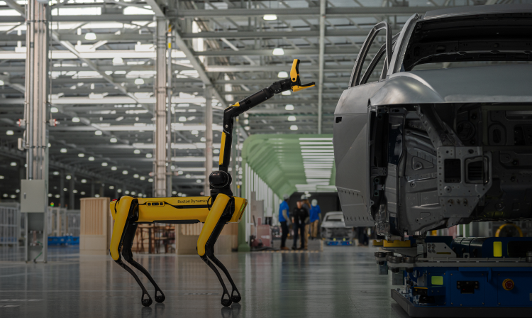 외관 품질 검사에서는 보스톤 다이내믹스의 4족 보행 로봇 스팟(Spot)이 투입됩니다. 스팟은 메타프로(작업자)가 접근하기 어려운 부위까지 정확하게 검사할 수 있습니다. 또, 검사 결과를 조립 로봇에 피드백해 최상의 차량 외관 품질을 유지합니다.