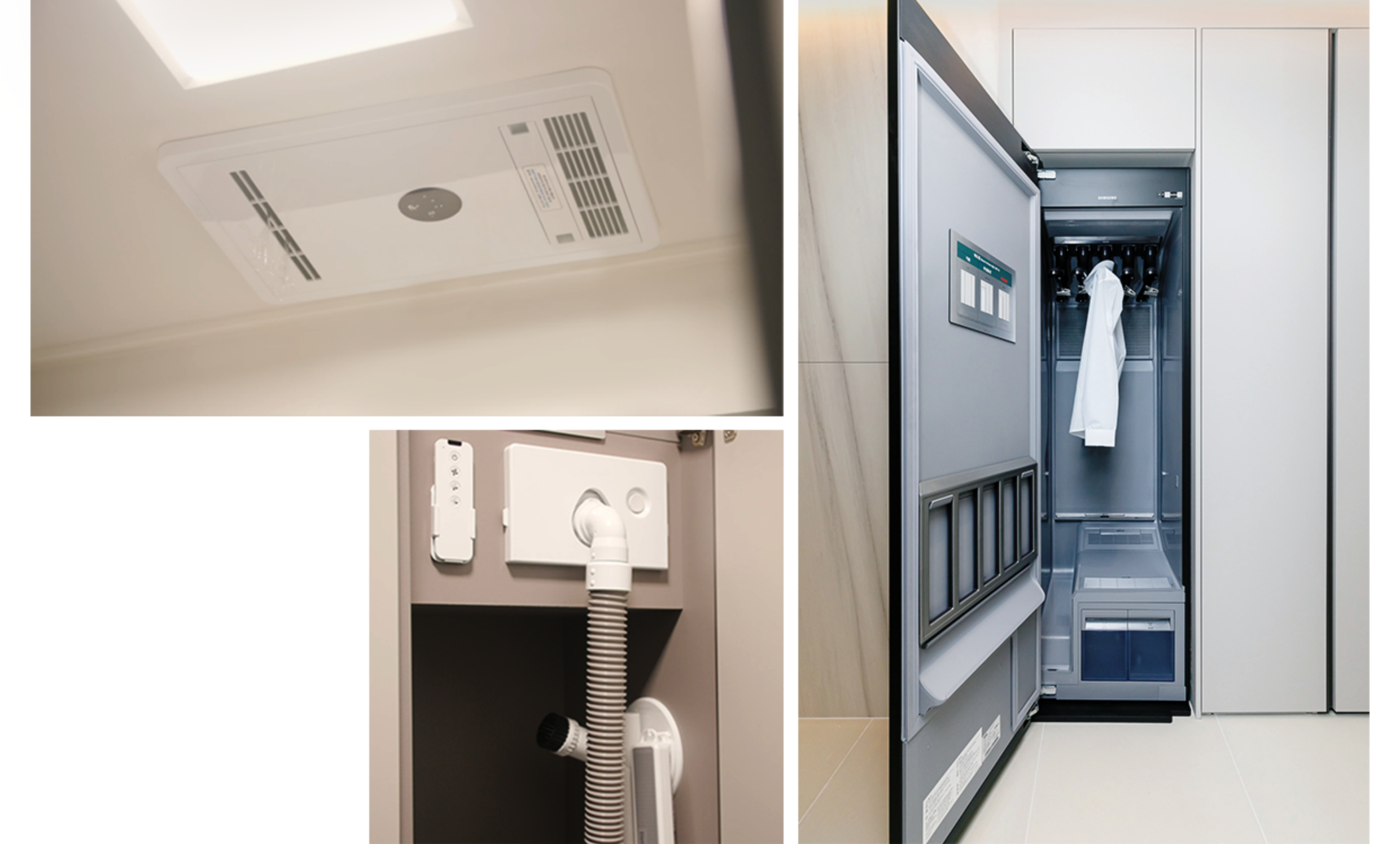 이에 현대건설은 외부 물질이 집 내부로 들어오는 것을 최대한 줄이는 아이디어를 제안하고 있습니다. 출입 동선을 따라 위생을 위한 가전과 위생용품 수납 공간을 마련하고, 건식 세면대를 현관과 가깝게 두는 것이죠. 가령 현관에서 에어 샤워를 통해 잔여 먼지를 제거하고, 복도장에 비치한 소독제를 사용한다면 외부 먼지와 바이러스의 유입을 최대한 막을 수 있습니다. 외투 또한 현관 근처에 설치한 의류 관리기로 관리할 수 있답니다.