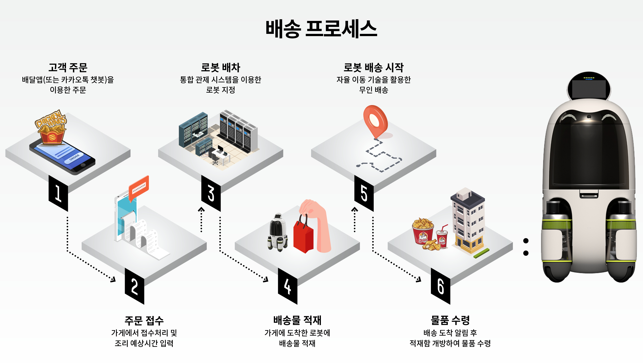 무인 배송을 위해서는 관제 시스템이 필요합니다. 그러나 사용자에게 어려운 부분은 없습니다. 고객과 가게가 이용하는 시스템은 기존과 같거든요. 고객이 음식 배달 앱을 이용해 주문하면 가게는 접수 처리 후 조리 예상시간을 입력합니다. 이때 관제실은 주문에 로봇을 배치합니다. 로봇이 가게에 도착하면, 가게에서는 로봇에 음식을 싣고 출발 처리를 하면 됩니다. 고객은 알림으로 배달 현황을 확인할 수 있으며, 이후 로봇의 적재함을 열어 물건을 꺼내면 됩니다.
