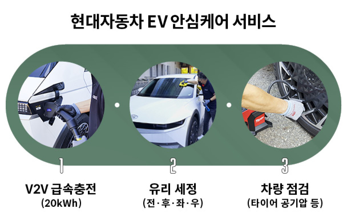현대차는 V2V 급속충전 시스템을 활용한 긴급충전 서비스 외에도 전기차 환경 개선을 위한 다양한 서비스를 선보이고 있다. 지난 11월에 도입한 EV 안심케어 서비스가 대표적이다. EV 안심케어 서비스는 B2B 전기차 전용 통합케어 솔루션으로, V2V 기술을 활용한 급속 차량 충전은 기본이고 유리세정과 차량 점검 서비스를 함께 제공한다. 현대차그룹은 이와 같은 전기차 관련 서비스를 지속적으로 확장하여 전기차를 구입한 고객이 걱정 없이 차량을 운용할 수 있도록 노력을 기울일 예정이다.