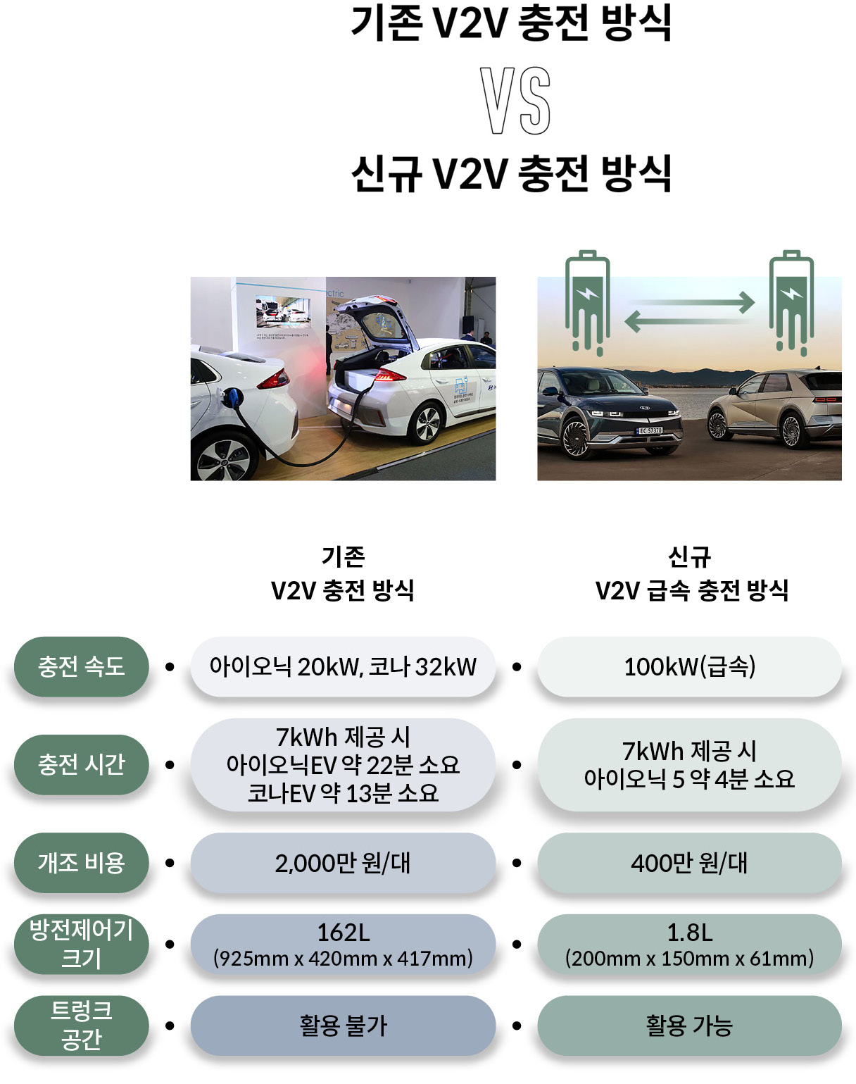 현대차그룹이 세계 최초로 개발한 V2V 급속충전 기술을 적용할 경우 162L에 육박한 방전 제어기를 서비스 차량의 트렁크에 설치할 필요가 없어진다. 새로운 방전 제어기는 1.8L 수준으로 작아진 형태로 설치되기 때문에 트렁크의 활용도가 높아지는 장점이 있다. 또한 기존 2,000만 원대에 달하던 개조비용은 400만 원대로 축소되어 비용도 절감된다. 이러한 절감 효과는 결국 고객 서비스의 품질 향상에 기여하게 될 것이다.