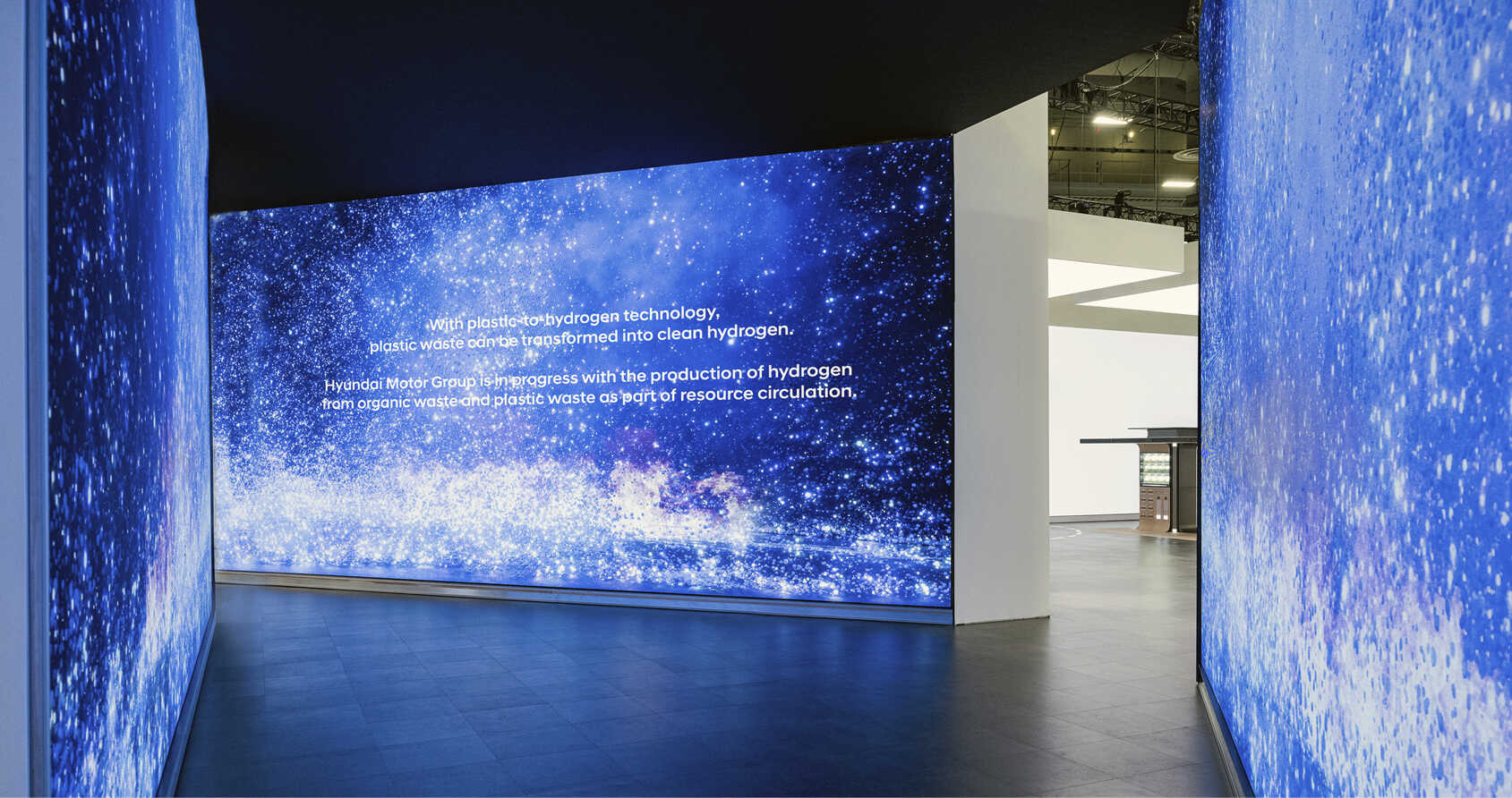 현대차의 전시 부스에 들어서면 거대한 디스플레이가 관람객을 맞이한다. 총 3면의 디스플레이와 멀티 채널 스피커를 활용한 음향 효과를 통해 관람객에게 몰입감 있는 미디어 경험을 제공한다. 해당 디스플레이에는 폐플라스틱이 6단계의 공정을 거쳐 청정 수소 에너지로 전환되는 과정을 다루는 영상이 재생된다. 파쇄, 용융(액체화), 가스화, 가스 정제, 수소 생산 등의 공정을 플라스틱 관점으로 설명해 누구나 쉽게 이해할 수 있도록 구성한 것이 특징이다.