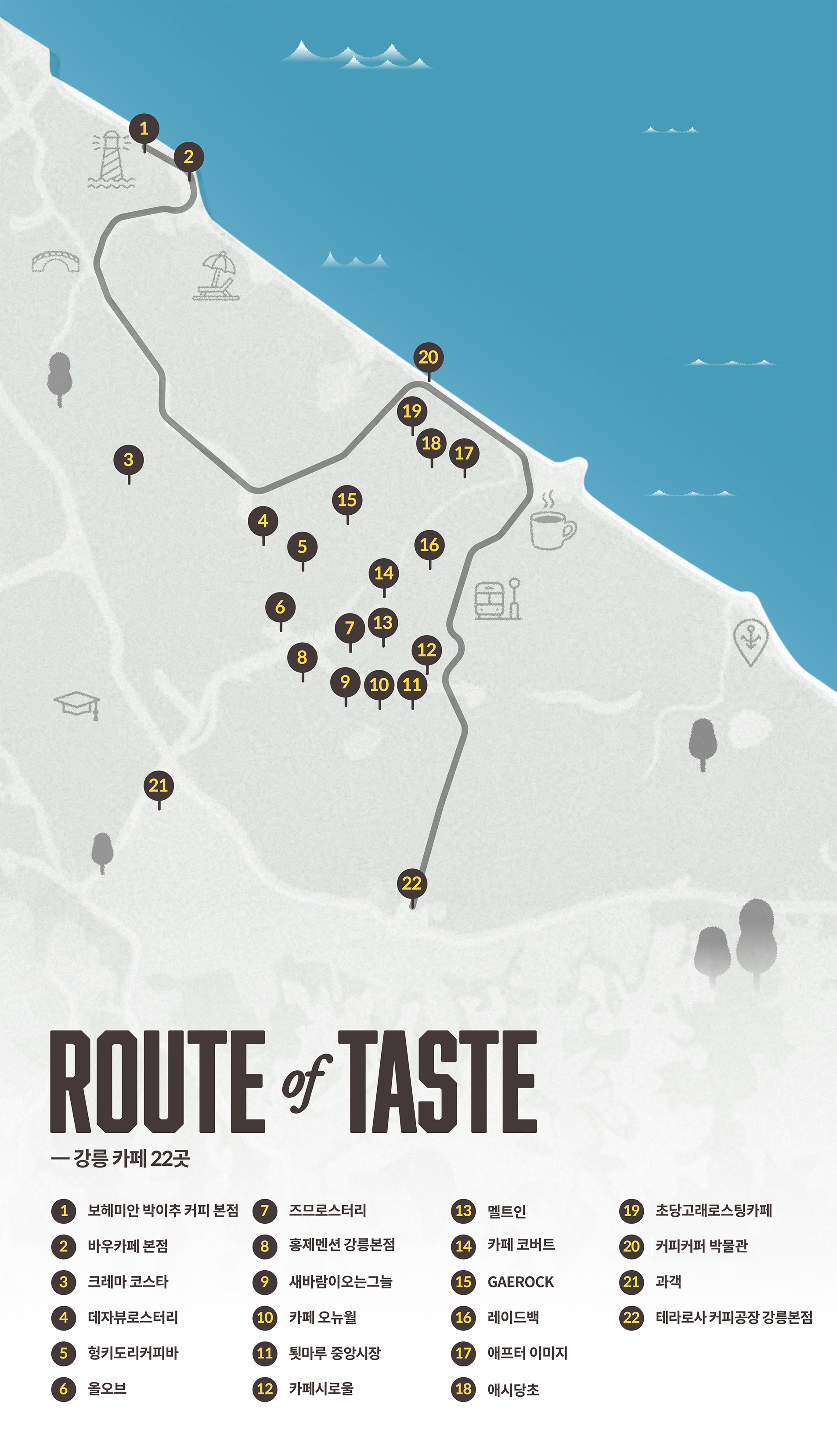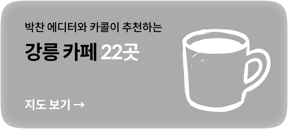 이번 여정에서 방문한 카페를 포함해 라이프스타일 에디터 박찬과 카페 스케쳐 카콜이 직접 큐레이션한 22곳의 카페를 모은 강릉 카페 지도. 아래 버튼을 클릭하면 네이버지도 리스트로 받아볼 수 있습니다.