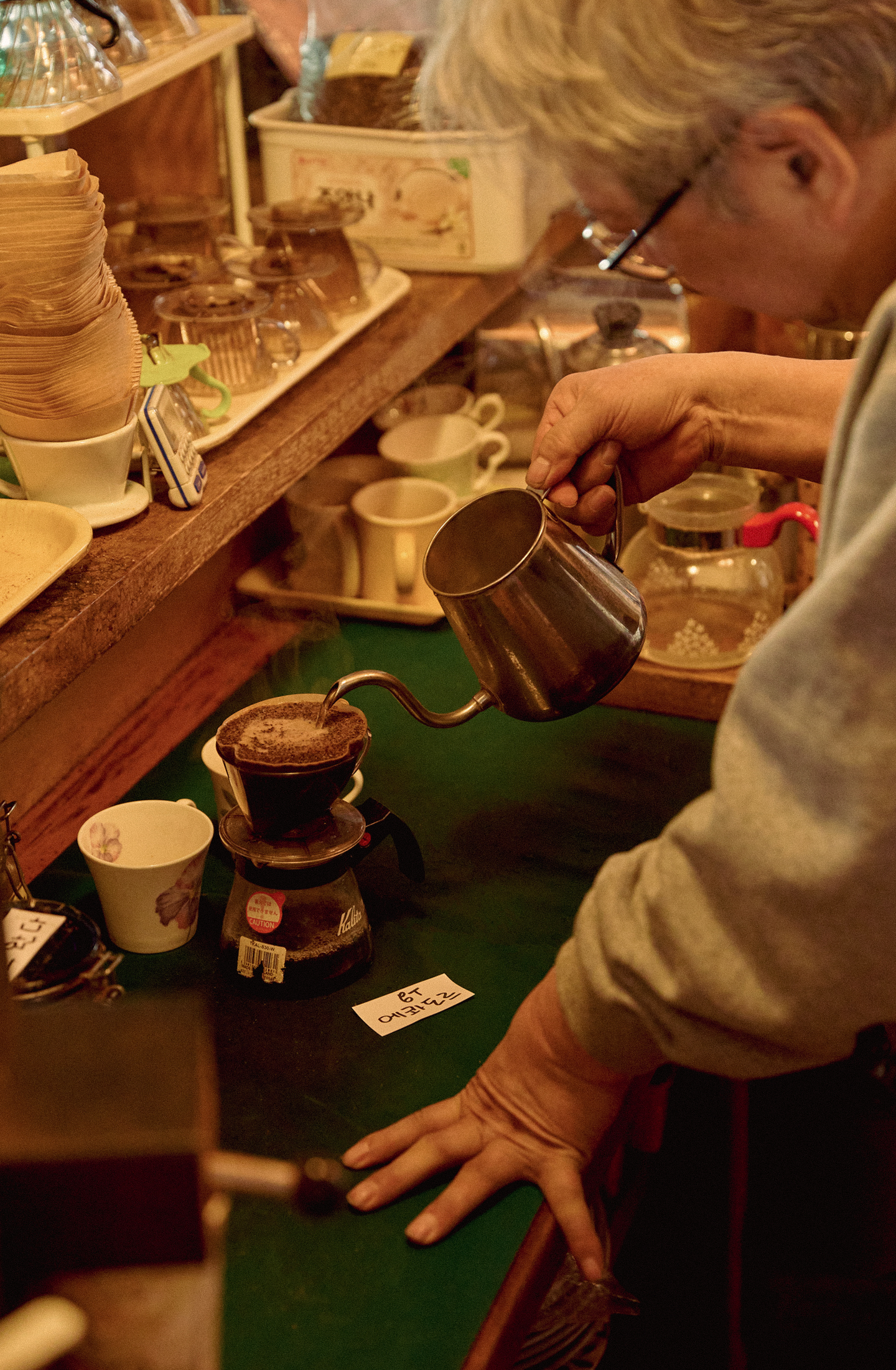 고령에도 박이추 선생님은 여전히 드립 커피를 직접 내립니다. 천천히, 그리고 일정하게. 그 리듬 덕분인지 커피는 식어가는 동안에도 맛의 균형이 크게 흐트러지지 않습니다.