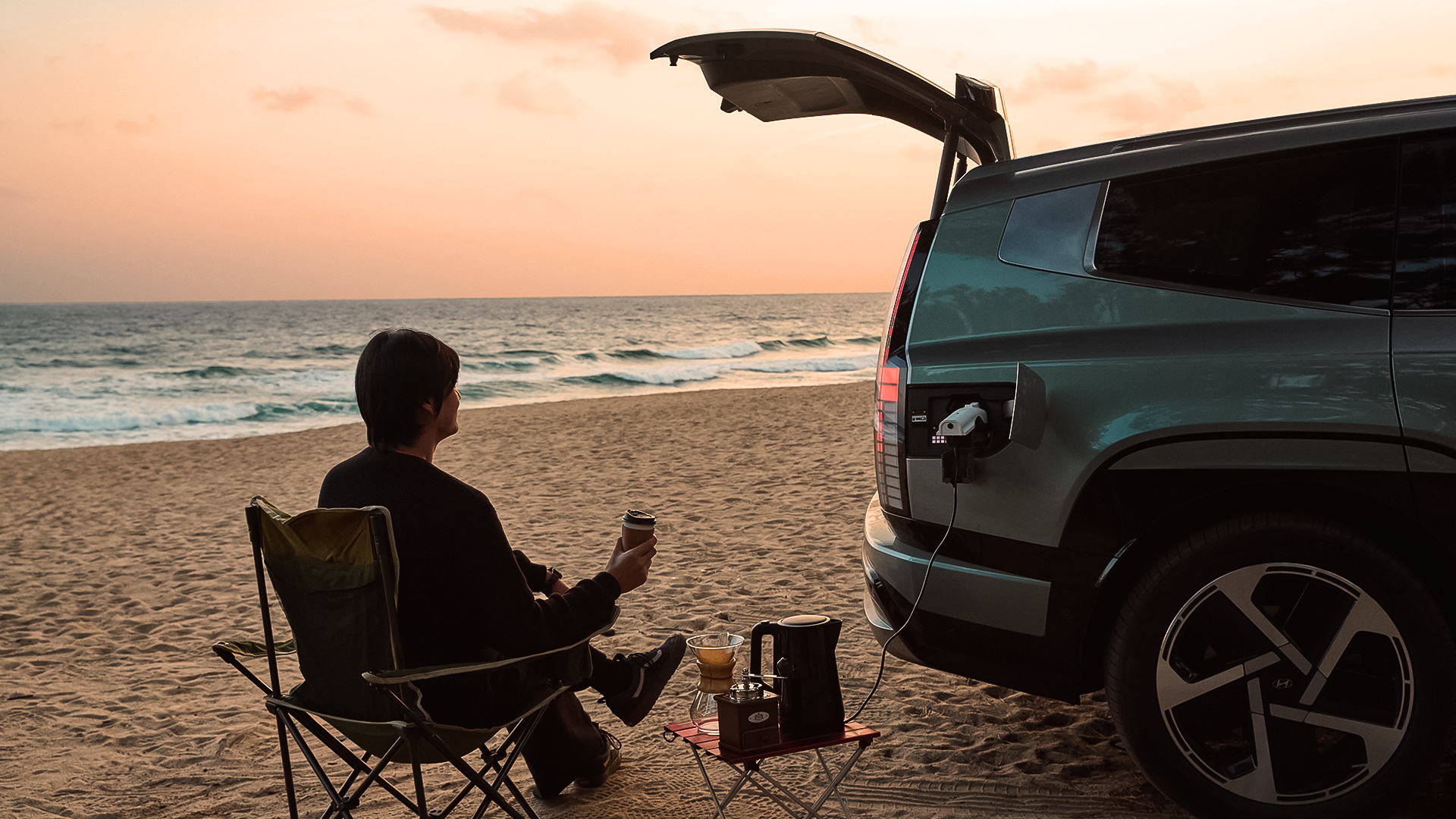 V2L(Vehicle to Load) 커넥터에 커피포트를 연결하자, 차에 저장된 전기가 물을 데우는 열로 바뀝니다. 이동을 위해 축적해둔 에너지가 이제는 휴식을 위한 온기로 전환되는 순간입니다.
