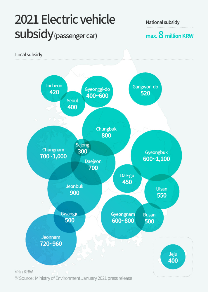 Through the newly reallocated eco-friendly vehicle subsidy in 2021, the government announced, “We plan to achieve the popularization of eco-friendly cars and carbon neutrality in the transportation sector at an early stage,” and they added, “We plan to operate the subsidy system in the future in response to changes in market conditions and demand.” In order to receive electric and fuel cell electric vehicle subsidies, check the public announcement of the local government's supply business, visit dealerships, fill out the vehicle purchase support application and contract, and then submit the application forms.