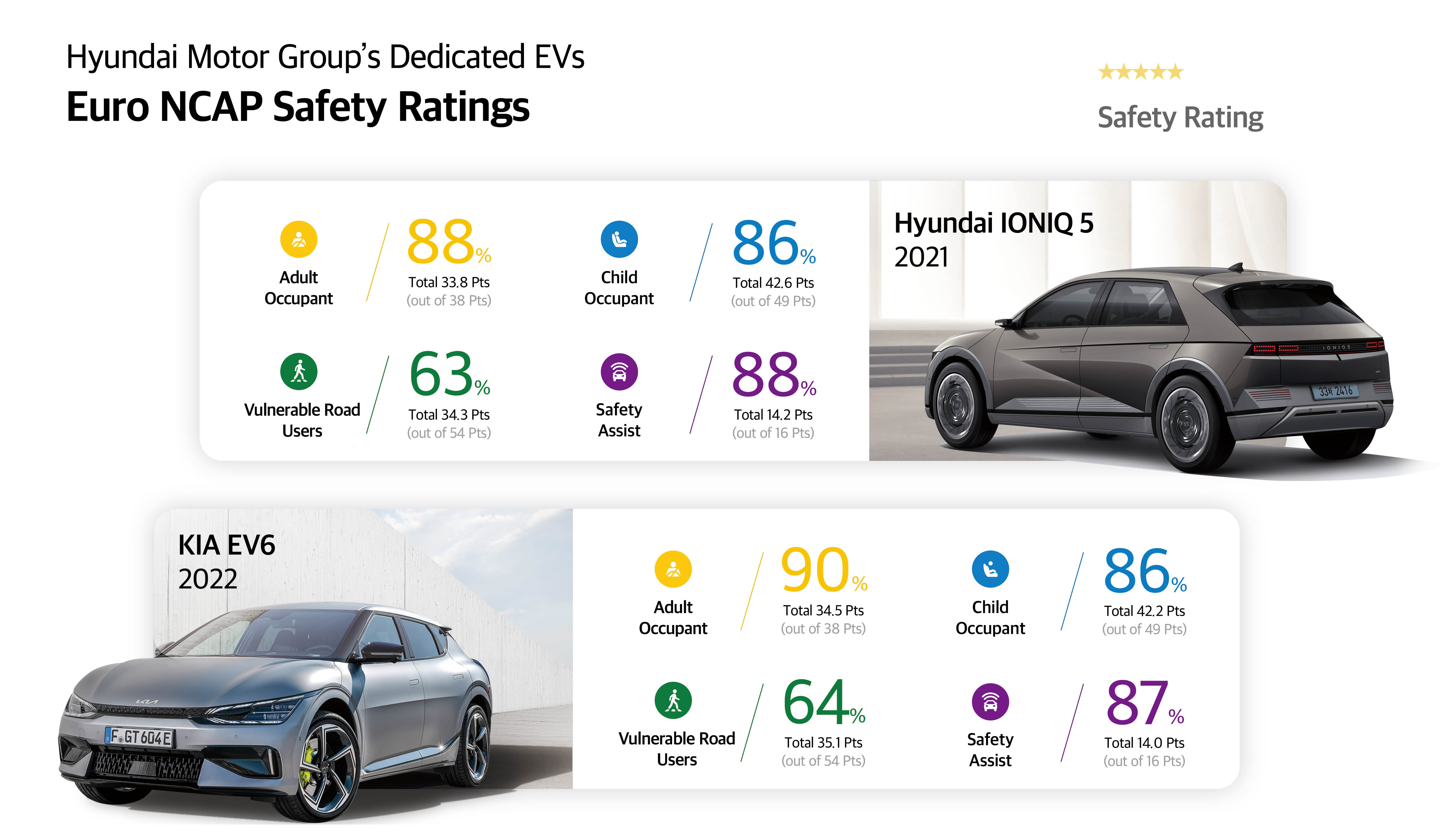 Currently, Euro NCAP’s safety rating is based on the assessment in 4 areas: Adult Protection, Child Protection, Pedestrian Protection, and Safety Assist. After rating each item, it is converted into a five‒star rating overall. Here, GV60 obtained 34.1 points for adult protection, 43.0 points for child protection, 34.2 points for Pedestrian protection, and 14.1 points for Safety Assist, and obtained 5 stars, the highest grade, in the comprehensive evaluation, proving its excellent safety.